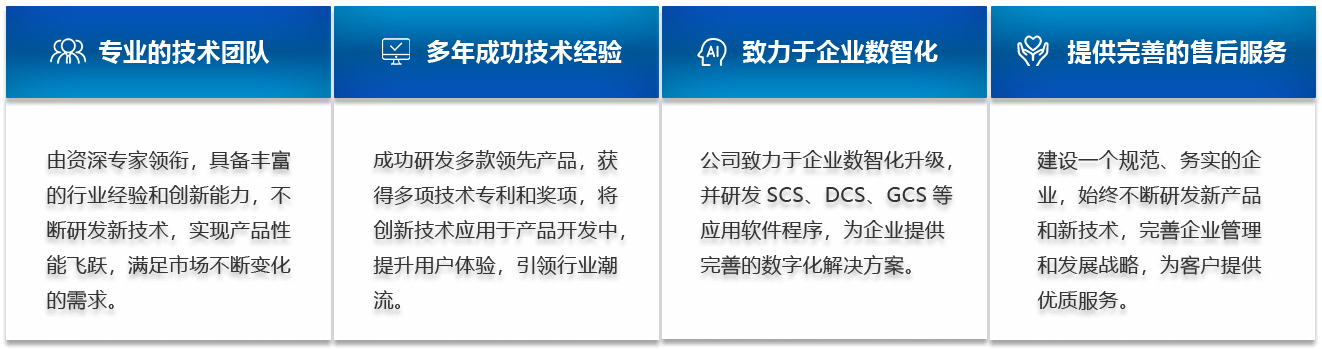 核心产品: 1.DCS设备安全管理系统:特种设备、常规设备等全生命周期管理系统。 2.SCS数字化智能生产管理:制造业生产全过程管理,提供企业智能化管理“最后1米”解决方案。 3.GCS气瓶智能追溯系统: 一瓶一码、芯智加持、群读群扫、实时上传、政企共需、降本提效、政府后台、一键搞定。 4. 智慧空压站管理平台:环保监测与能耗优化解决方案、供应链协同管理系统。