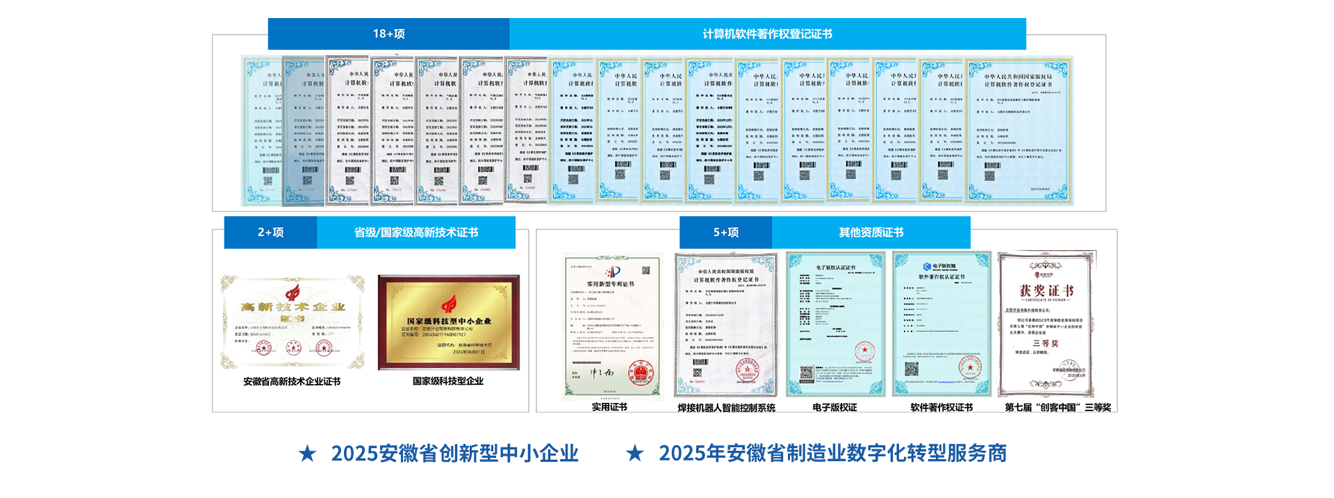 公司为国家高新技术企业、国家科技型中小企业、安徽省制造业数字化转型服务商、安徽省创新型中小企业、第七届“创客中国”安徽省创新创业大赛三等奖。核心团队深耕IT行业、制造业多年,构建完整产品矩阵,与中国科大、合工大等高校建立产学研深度协同,实现“高校科研-企业落地-行业推广”的创新闭环。拥有自主产品已获得多项软件著作权、实用新型专利及发明专利,