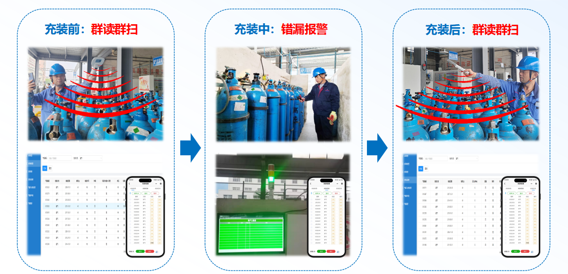 场景化演示:还原充装检、物流装车检、发车核验、送达核验、空瓶回收、回瓶核验的群读群扫作业流程,展示气瓶智能追溯的极速效率。